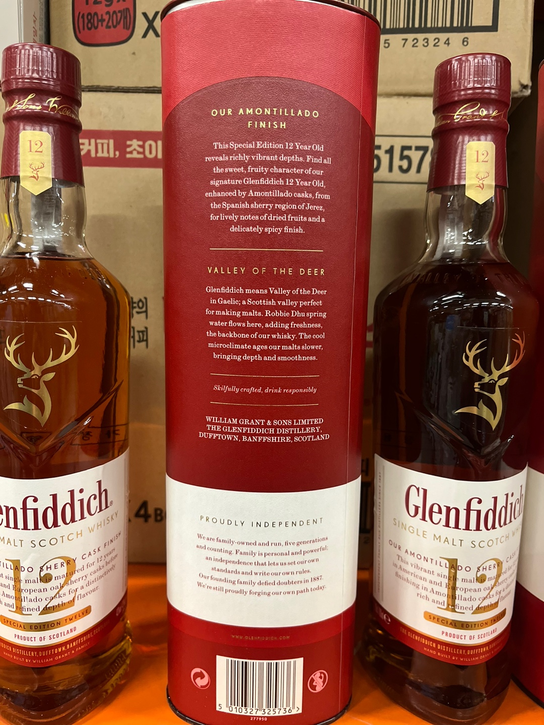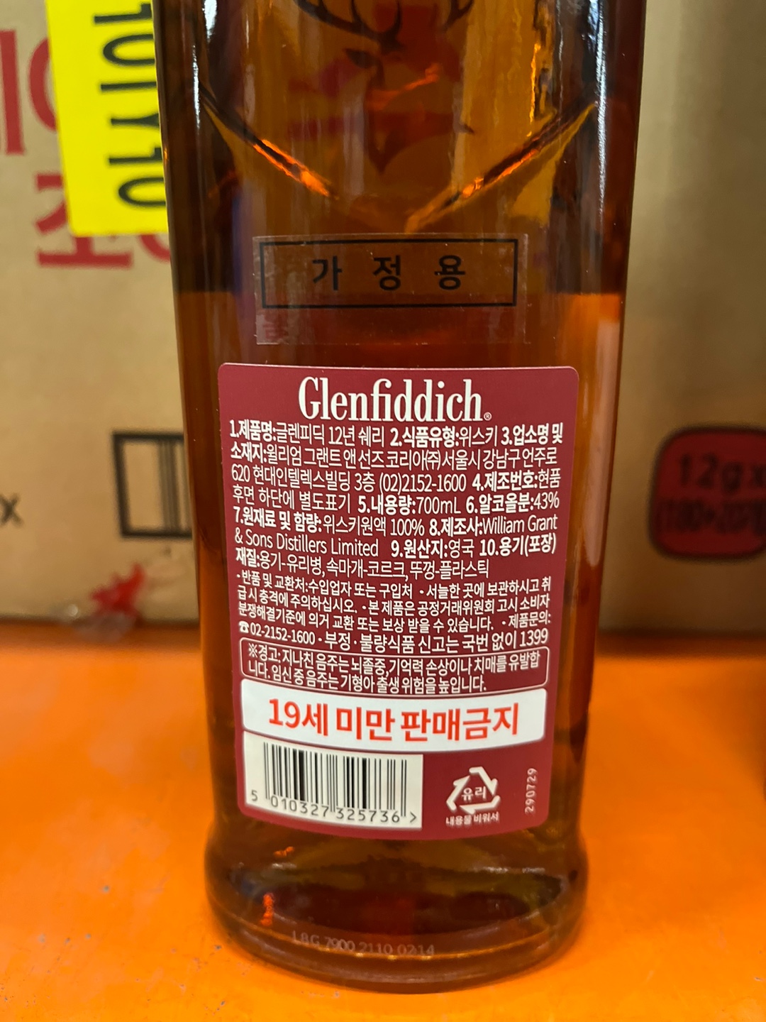 글렌피딕 12년 셰리캐스크는 700ml 용량에 43도의 도수를 가지고 있습니다. 가격은 109,900원에 대형마트에서 판매하고 있습니다.