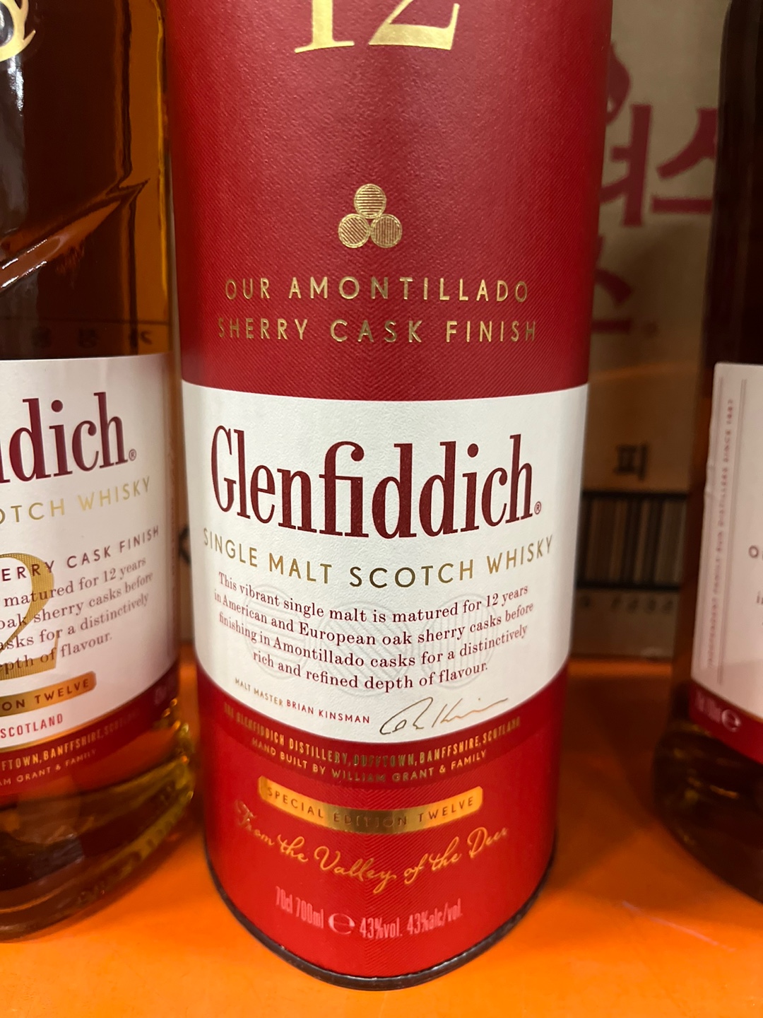 글렌피딕 12년 셰리캐스크는 700ml 용량에 43도의 도수를 가지고 있습니다. 가격은 109,900원에 대형마트에서 판매하고 있습니다.