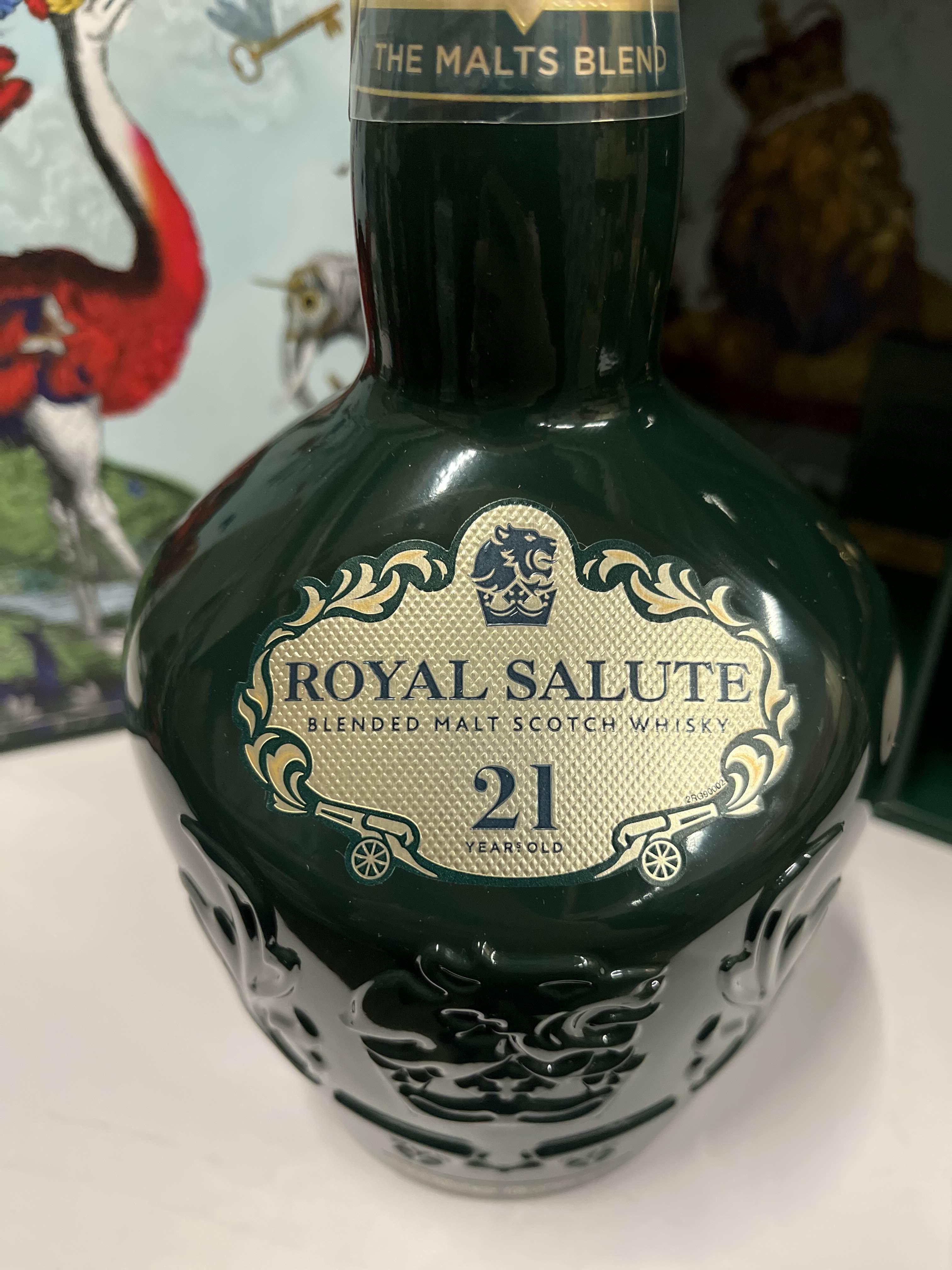 이번에 소개드릴 제품은 로얄 살루트 21년 더 몰트라는 제품입니다. 로얄 살루트는 보랏빛 나는 케이스에 도자기 병을 많이 생각하실 텐데요. 로얄 살루트 더 몰트는 초록색을 전체적으로 적용하고 있습니다.