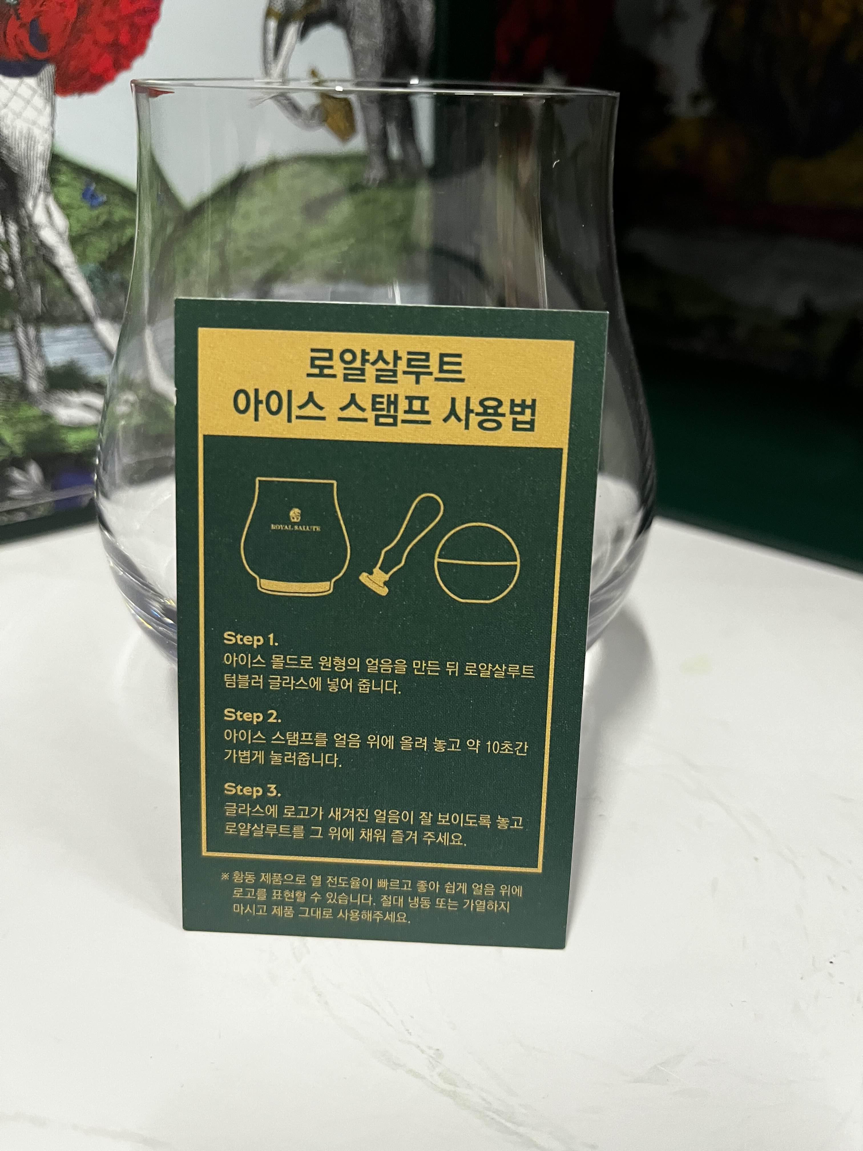 아이스 몰드에 얼음을 만들어 잔에 넣은 후 도장을 찍듯 눌러서 로얄 살루트의 상징을 새겨 넣는 것입니다. 자세한 사용법은 제품 안쪽 설명서에 친절히 적어 놓았습니다. 이러한 3가지 구성품은 로얄 살루트의 맛을 극대화시켜 줄거라 생각합니다.