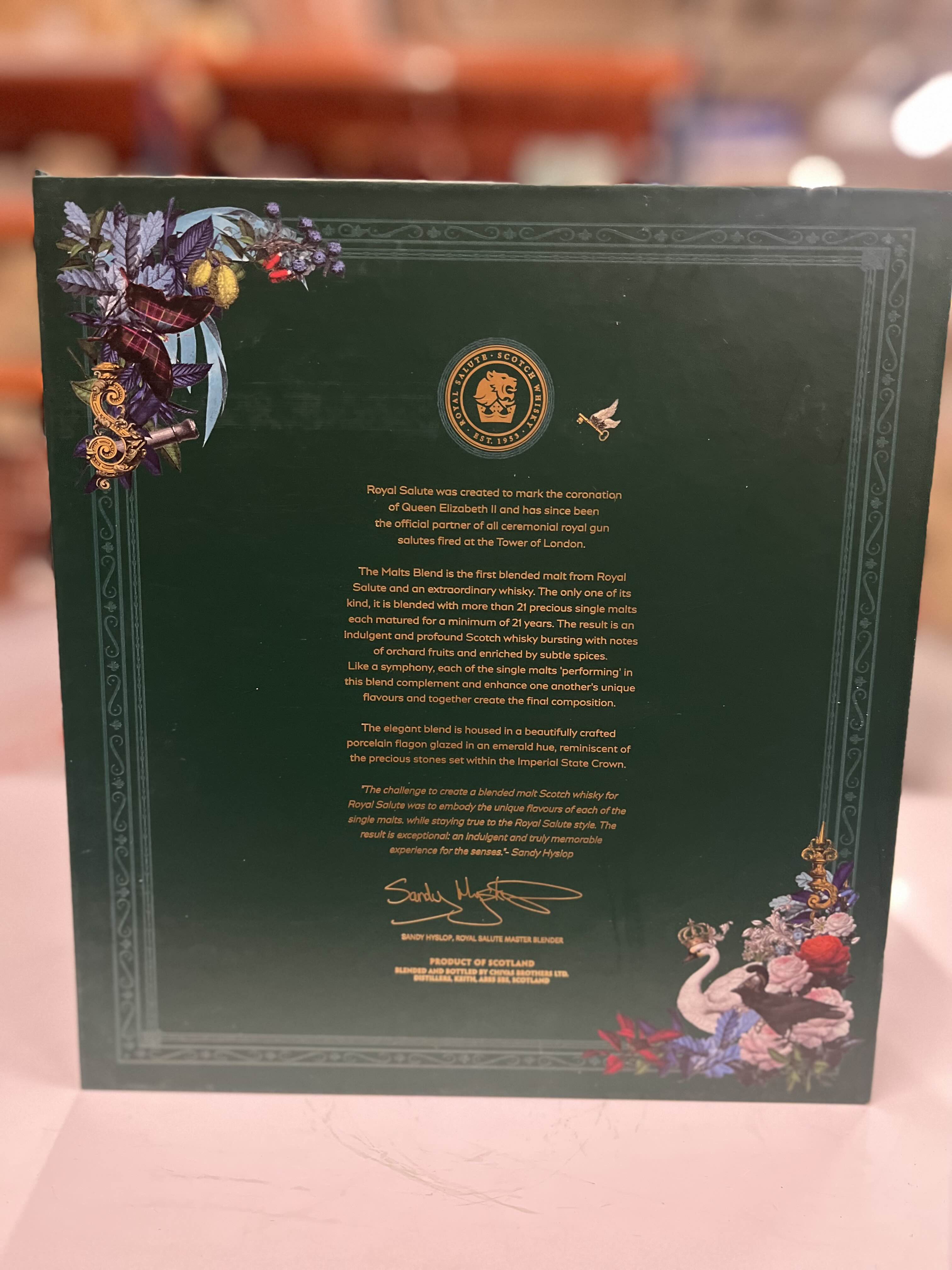 이번에 소개드릴 제품은 로얄 살루트 21년 더 몰트라는 제품입니다. 로얄 살루트는 보랏빛 나는 케이스에 도자기 병을 많이 생각하실 텐데요. 로얄 살루트 더 몰트는 초록색을 전체적으로 적용하고 있습니다.