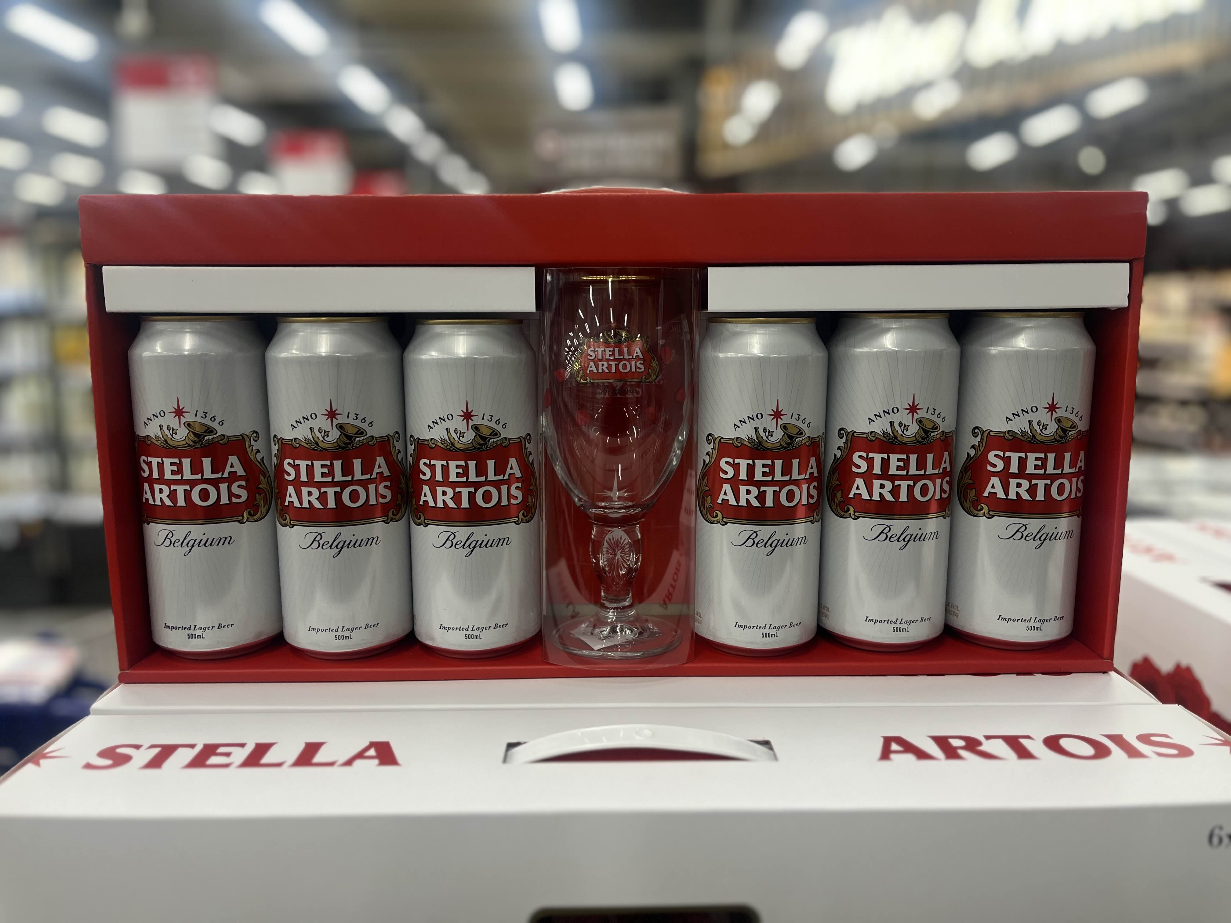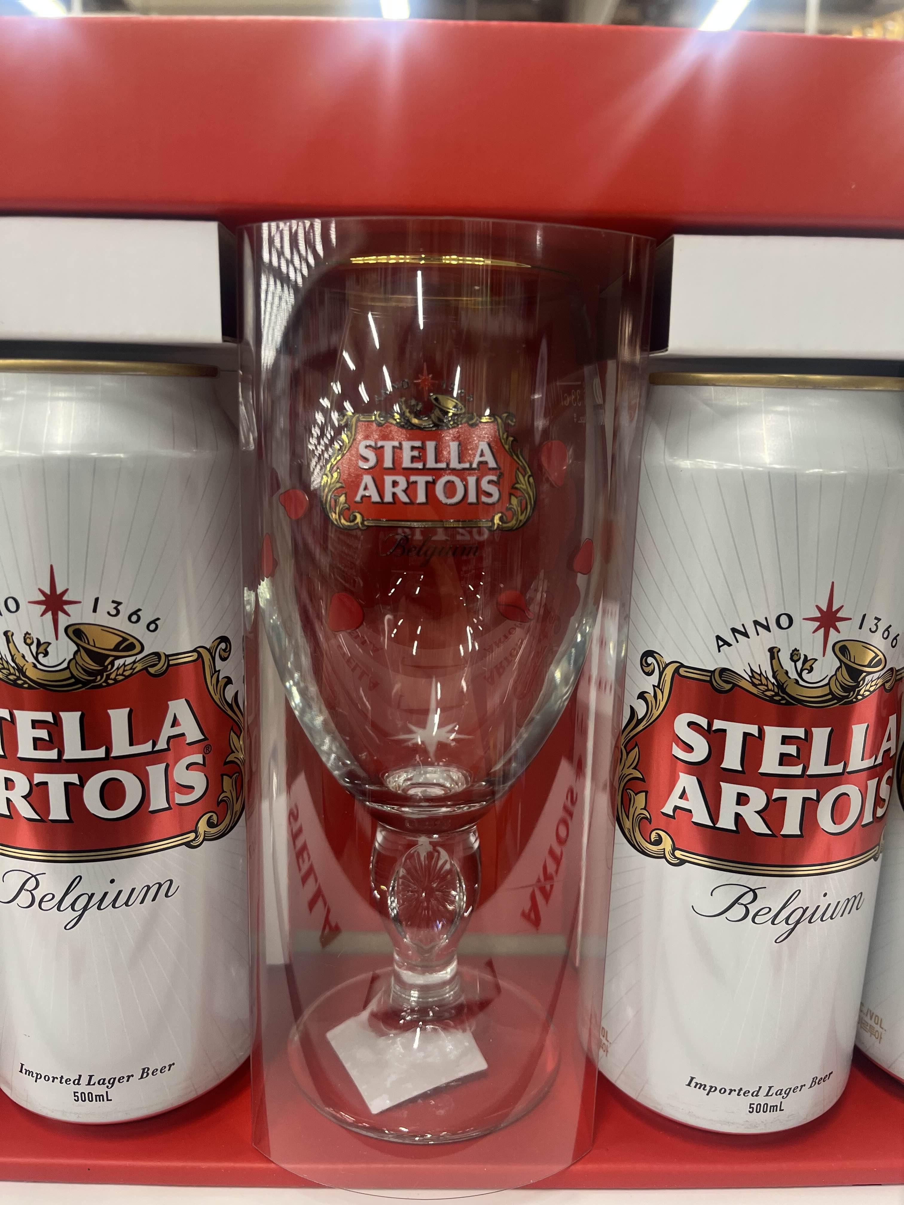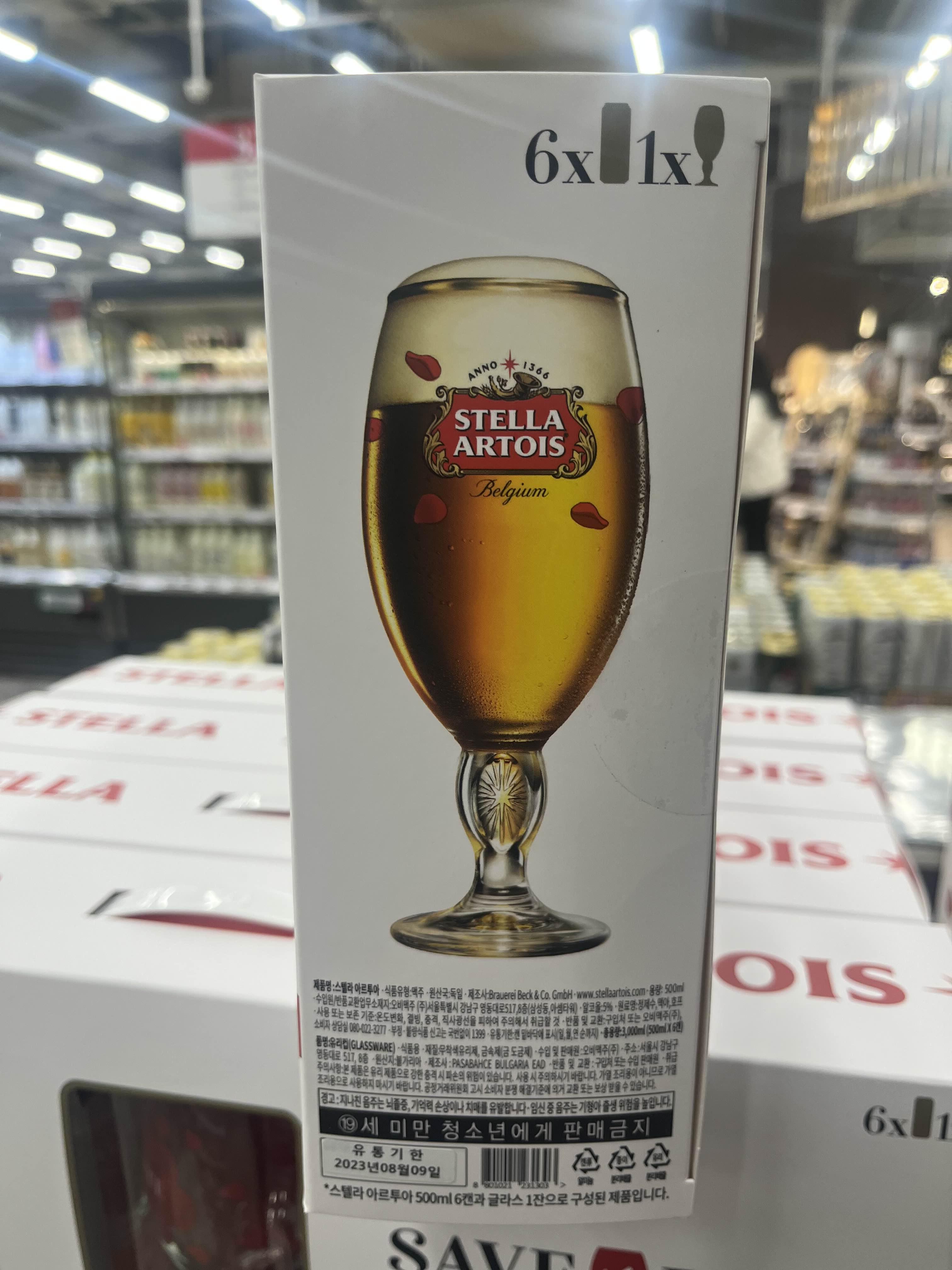 내용물은 스텔라 맥주 500ml 6캔과 스텔라 전용잔이 1잔 들어있습니다. 가격은 대형마트 기준 14,900원에 판매되고 있습니다.