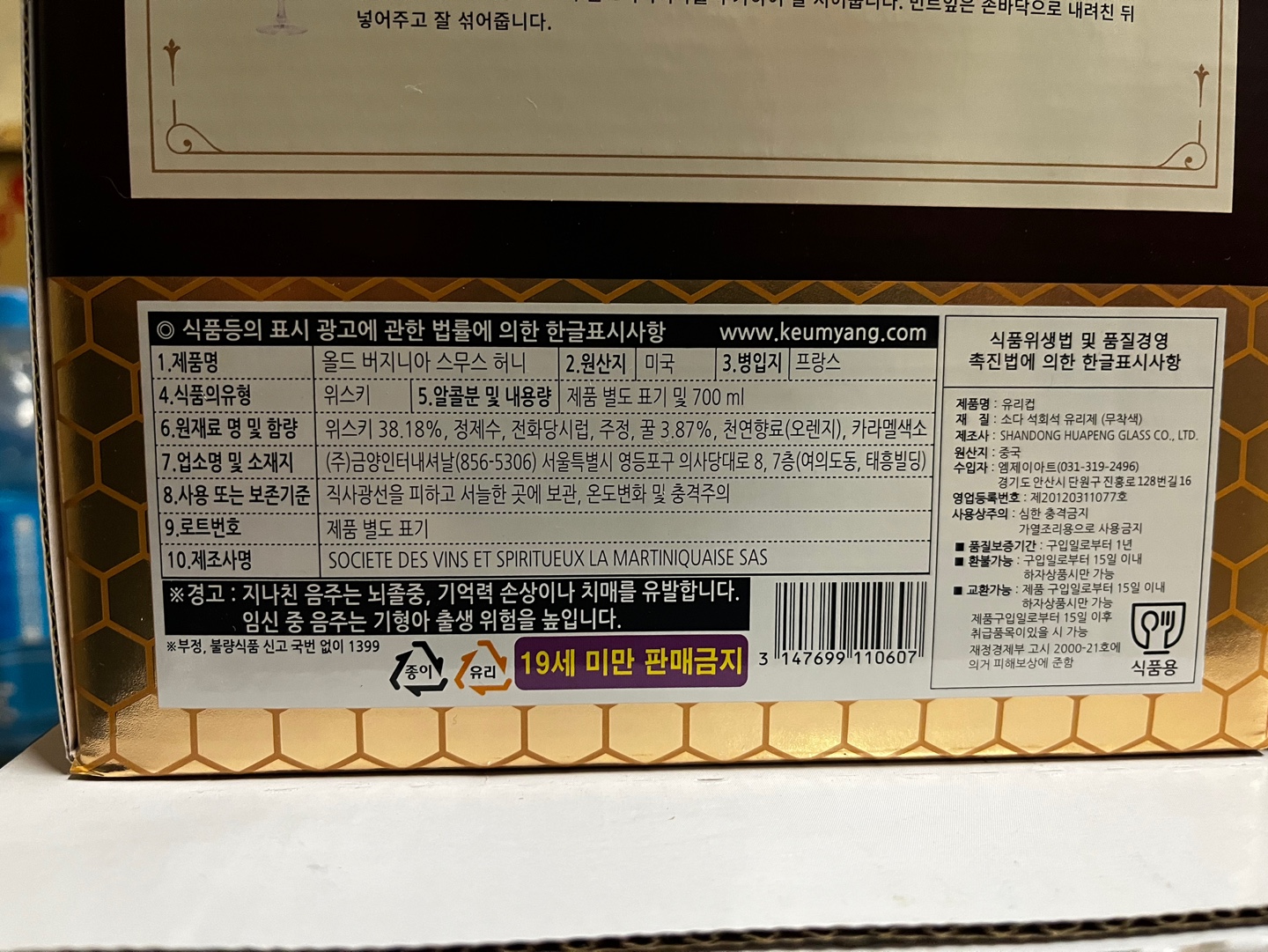 올드버지니아 스무스 허니는 제품명에서 나와있듯 꿀이 함유되어 있습니다. 잭다니엘 허니와 같은 꿀을 넣은 위스키가 있지만 올드버지니아 스무스 허니는 꿀이 상당히 많이 함유되어 있습니다.(꿀 3.87%) 위스키 원액은 38.18%가 들어가 있습니다. 다양한 재료를 섞은 만큼 분류는 리큐르로 되어있습니다.