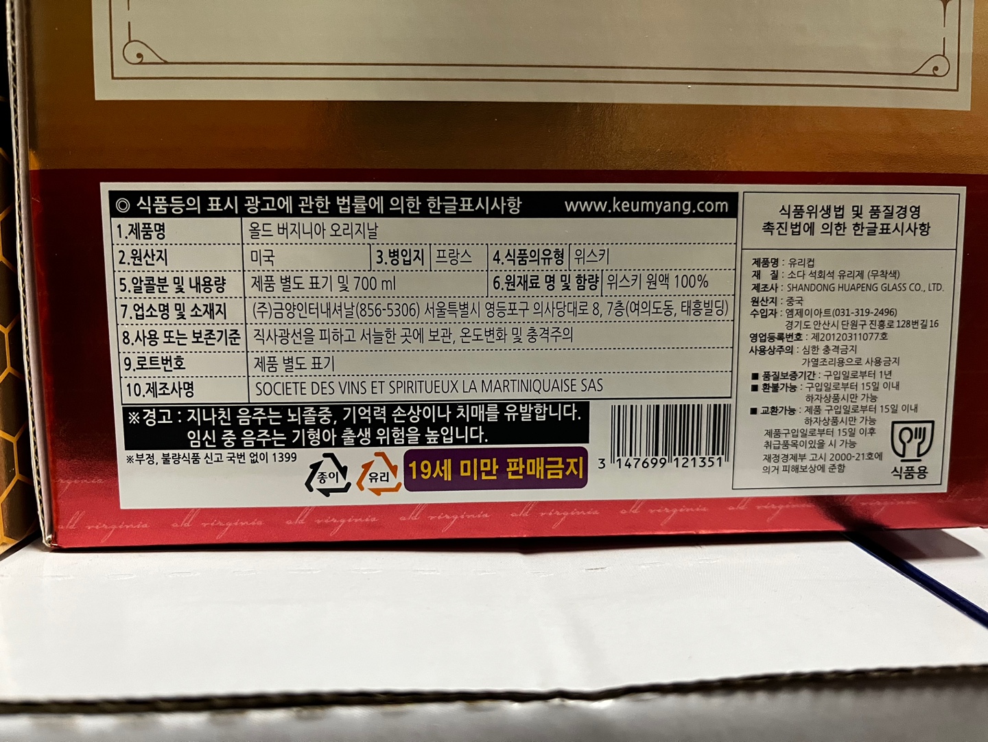 올드버지니아 오리지날은 700ml의 용량에 40도의 알코올 도수를 가지고 있습니다. 가격은 36,900원입니다.(대형마트기준)