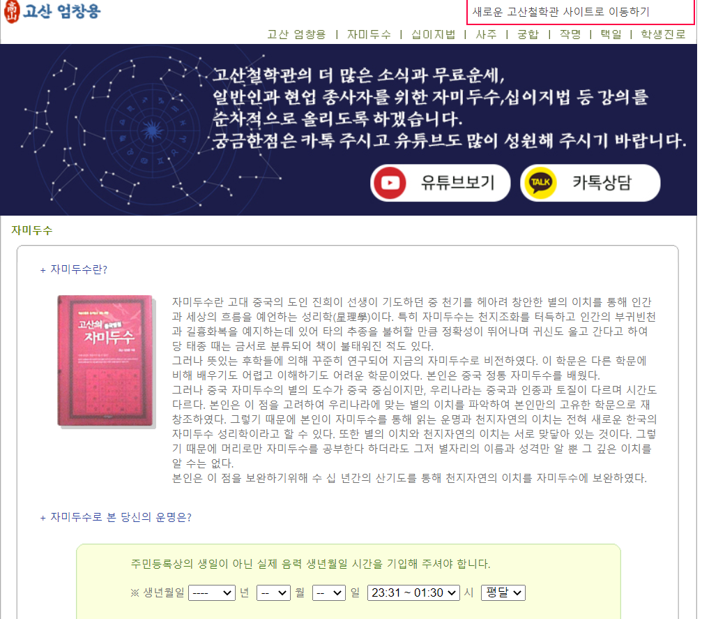 고산 엄창용 선생님이 운영하시는 사이트에서 제공하는 자미두수 입니다. 다양한 운세정보를 제공해 주는 고마운 사이트 입니다. 자미두수가 친숙하지 않으신 분도 있으시겠지만 과거를 돌아보고 미래를 계획할때 봐준다면 큰 도움이 되실거라 생각합니다. 사이트에 접속하시면 자미두수에 대한 자세하고 재미있는 설명을 접하실 수 있습니다.