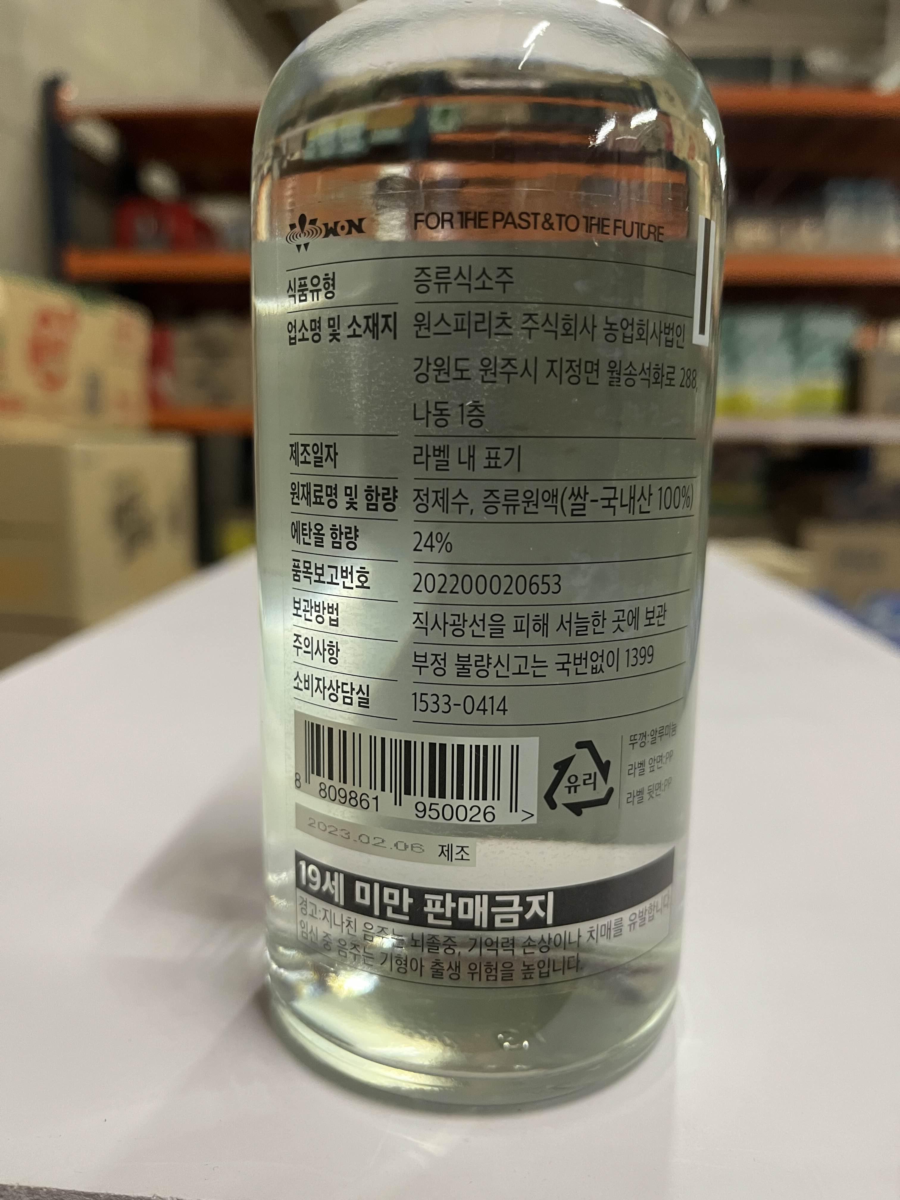 무광의 라벨지가 붙어있는 제품입니다. 일반적으로 소주가 16.5도 정도이고 증류식 소주가 주로 25도가 많은 것을 생각해 본다면 약간은 도수가 낮은 제품입니다.
