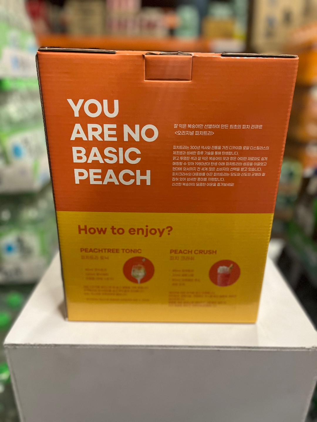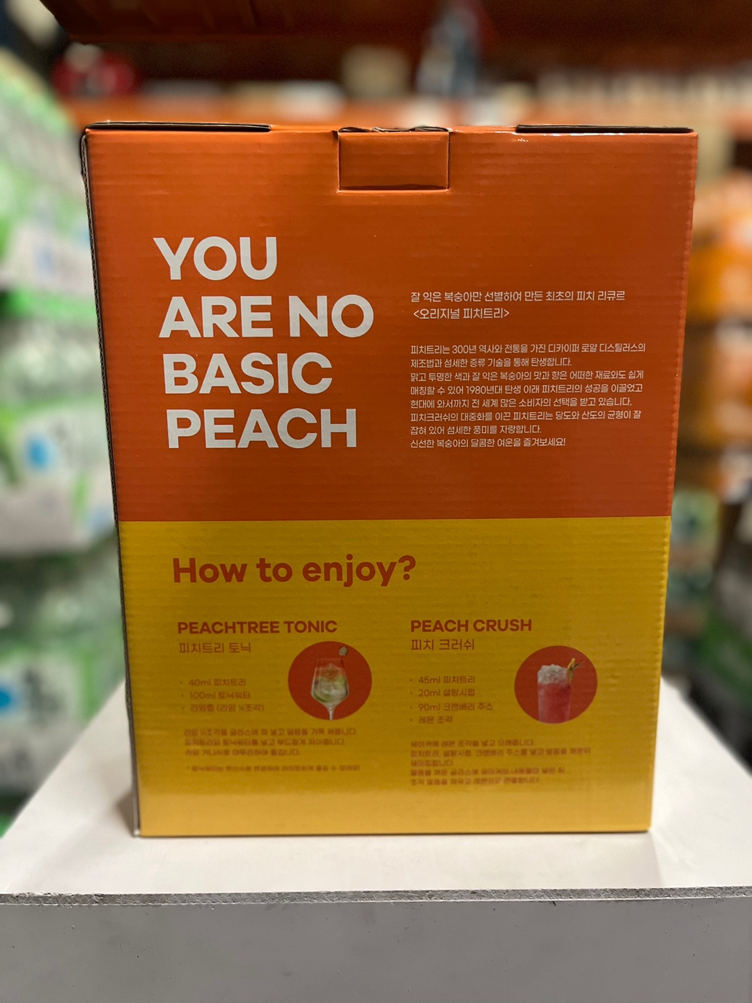 보통 낱병으로낱병으로 입고되어 판매하는 경우가 많지만 전용잔이나 피치트리만의 사은품을 제작해서 패키지 세트로 판매하기도 합니다. 가격은 낱병으로 구매했을 때와 같은 경우가 많기 때문에 가능하다면 패키지 상품을 구매하실 것을 추천드립니다.