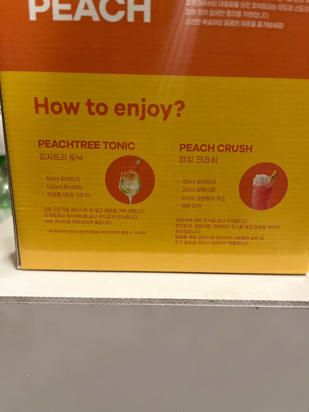 보통 낱병으로낱병으로 입고되어 판매하는 경우가 많지만 전용잔이나 피치트리만의 사은품을 제작해서 패키지 세트로 판매하기도 합니다. 가격은 낱병으로 구매했을 때와 같은 경우가 많기 때문에 가능하다면 패키지 상품을 구매하실 것을 추천드립니다.