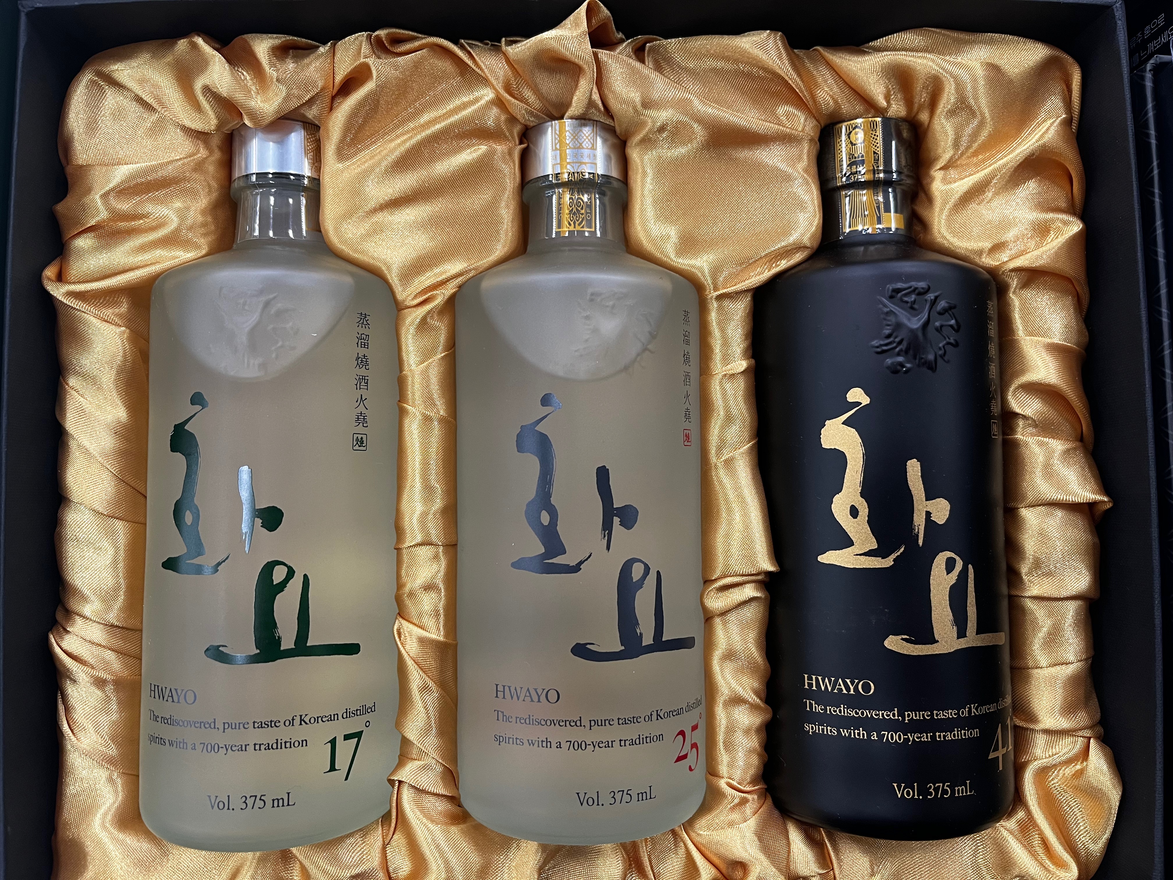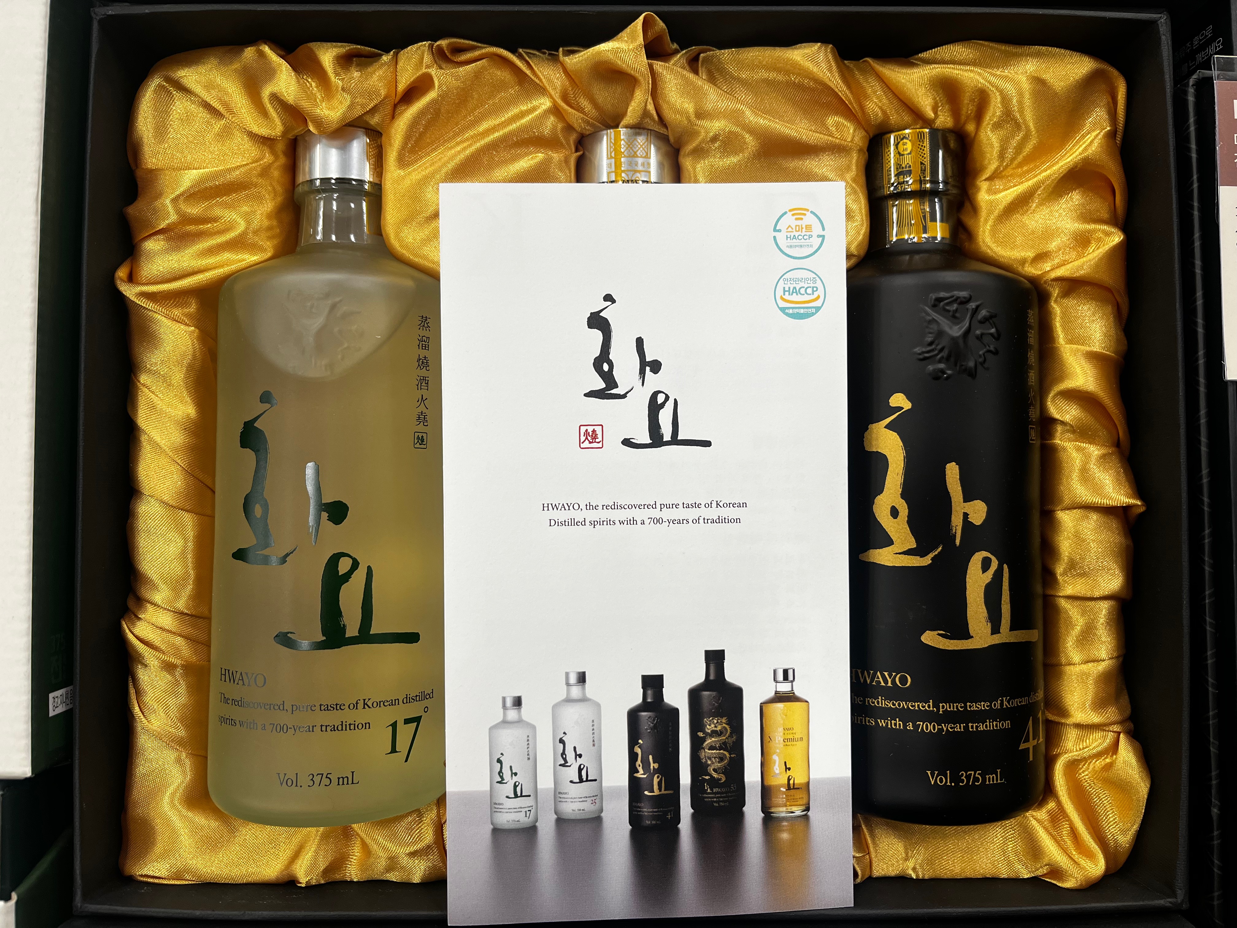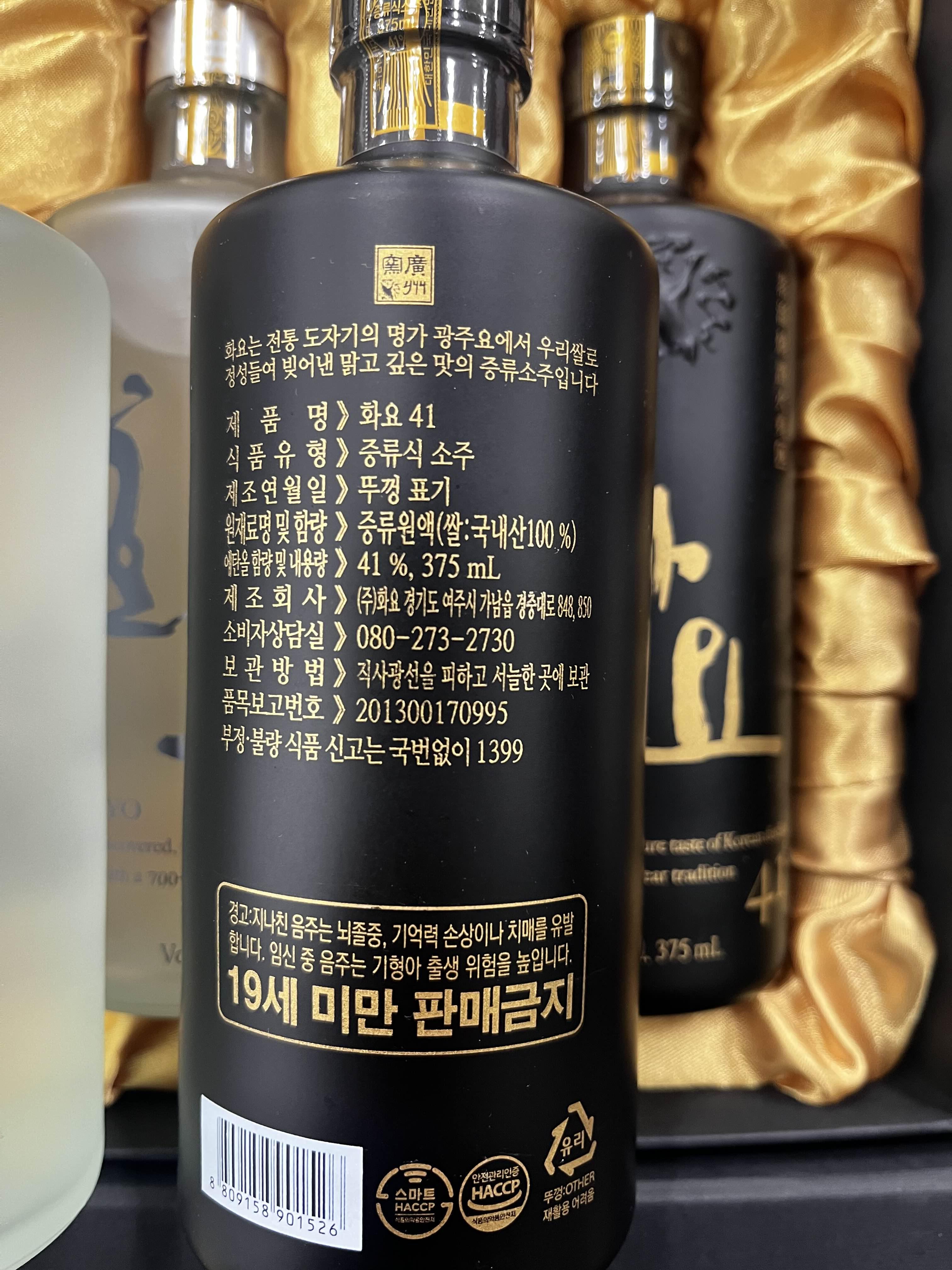 17도, 21도, 41도가 한병씩 총 3병으로 구성되어 있습니다. 화요 전용케이스와 종이가방으로 포장되어 있습니다.
