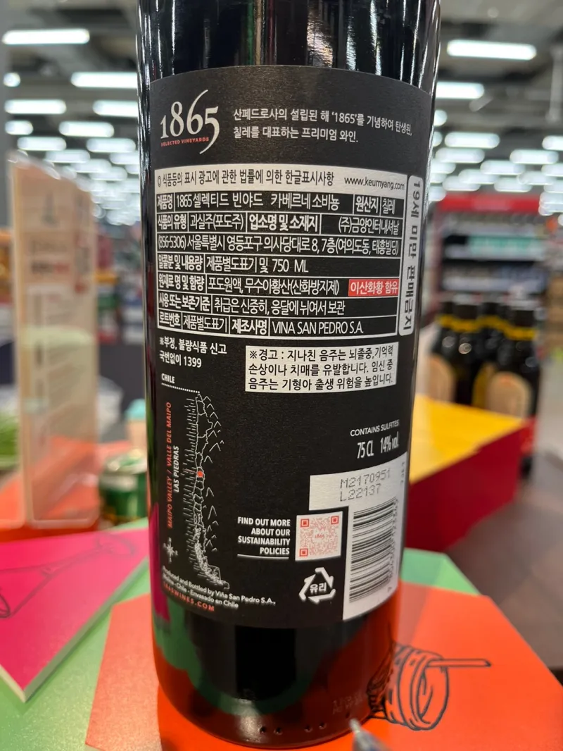 편의점에서도 구매가 가능한 제품입니다. 최근에는 와인을 전문적으로 다루는 편의점도 많이 생기고 있습니다. 1865 까베르네 쇼비뇽은 기본적으로 구비하는 경우가 많으니 방문해 보시길 바라며 그 외에도 규모가 큰 매장을 방문하시면 1865 제품을 만나실 수 있습니다.