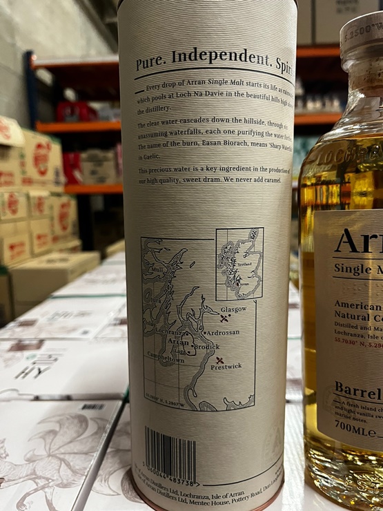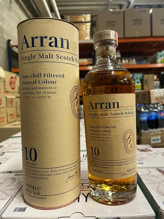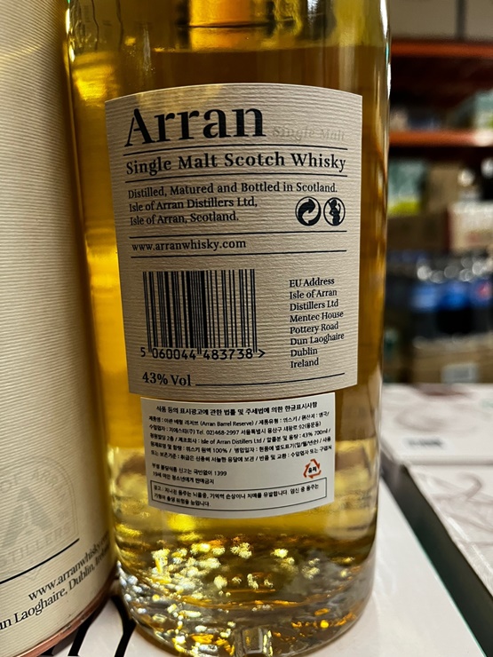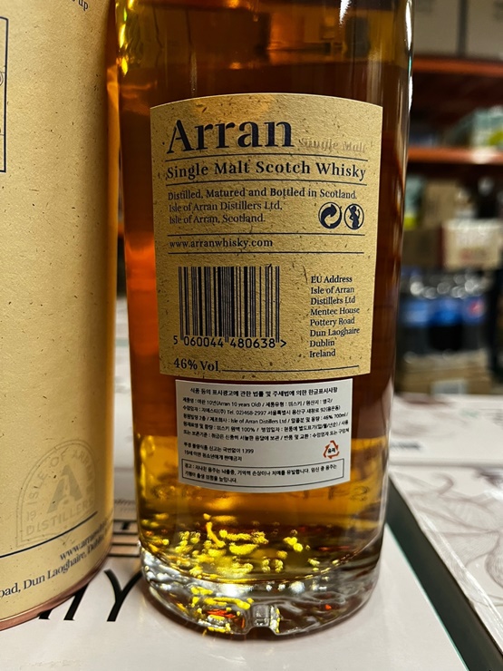 인공적인 캐러멜 색소를 넣지 않고 인공적인 과정을 배제하여 위스키를 생산하는 것으로 유명한 아란 싱글몰트 위스키입니다.