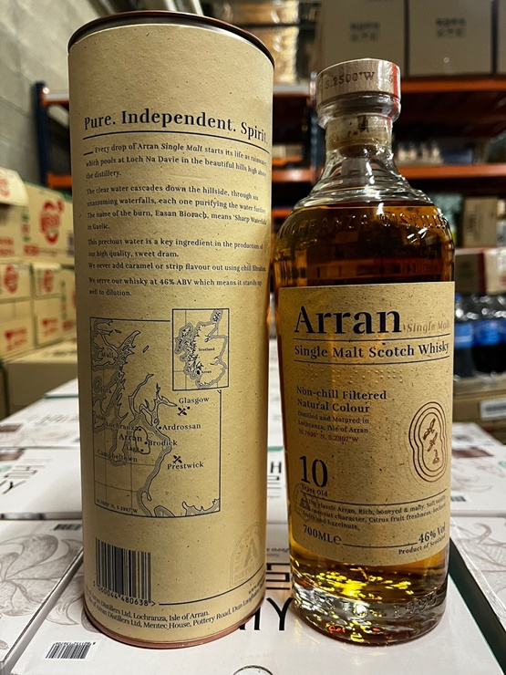 인공적인 캐러멜 색소를 넣지 않고 인공적인 과정을 배제하여 위스키를 생산하는 것으로 유명한 아란 싱글몰트 위스키입니다.