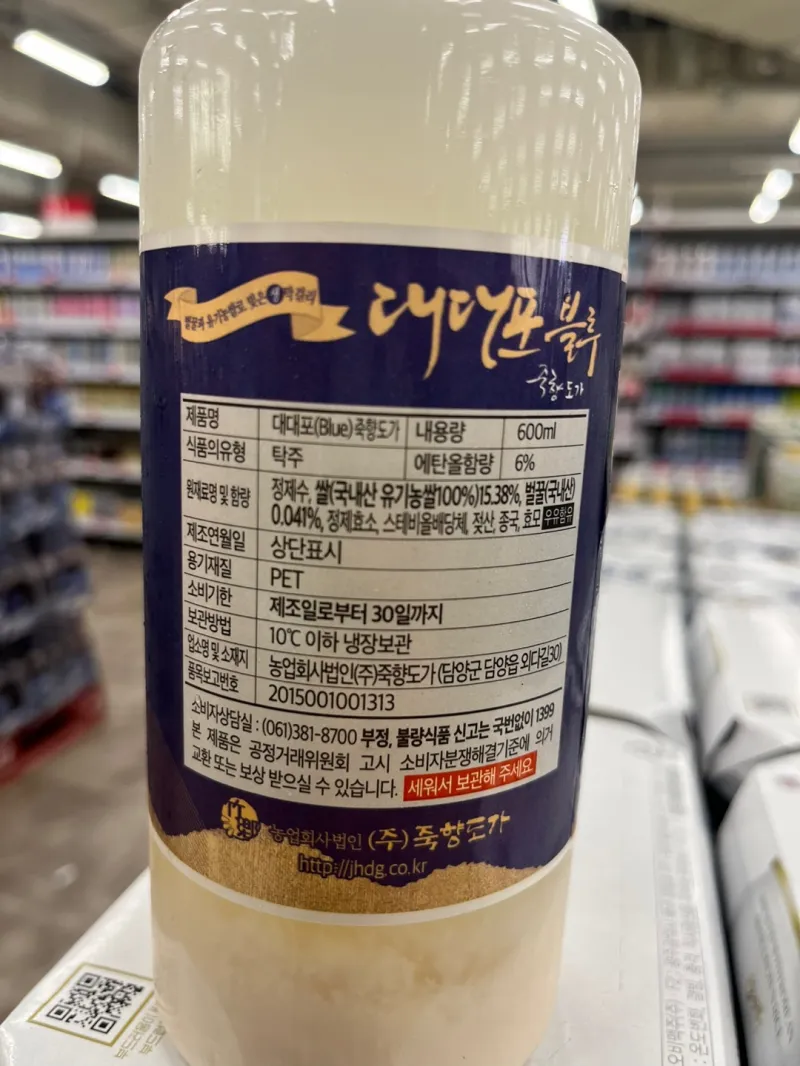 대대포 블루 막걸리는 전남 담양의 대표적인 막걸리로 죽향도가에서 생산하는 생막걸리입니다. 국내산 유기농쌀과 국내산 벌꿀을 사용한 것이 특징이며 은은하게 단 맛과 깔끔한 맛이 조화를 이루어 가볍게 마시기 좋은 제품입니다.