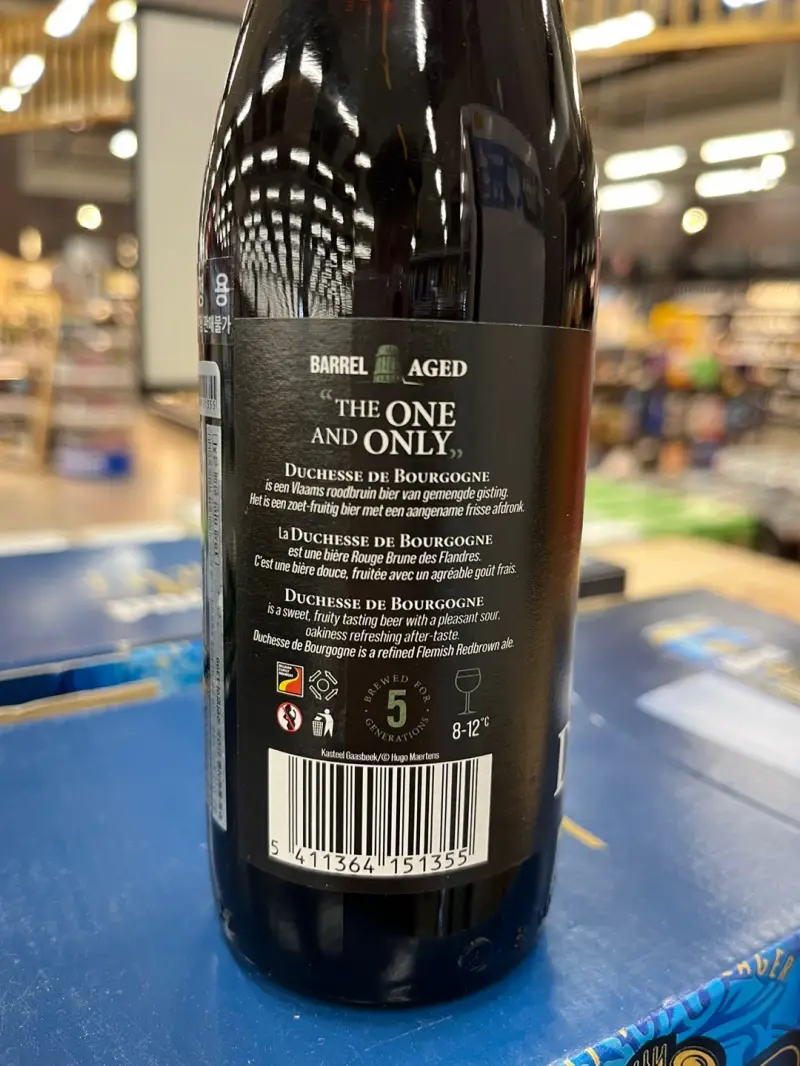플레미쉬 레드 에일은 와인 오크통에 숙성시켜 맥주를 만드는 방식입니다. 보통의 경우에는 10~20% 정도만 오크통에 숙성시킨다면 듀체스 드 부르고뉴는 100% 오크통에 발효, 숙성과정을 거쳐서 만들어진 제품입니다. 이때 사용한 오크통은 최고급 와인으로 불리는 샤또 딸보에서 사용한 것이니 듀체스의 품질은 최상이라 할 수 있습니다.