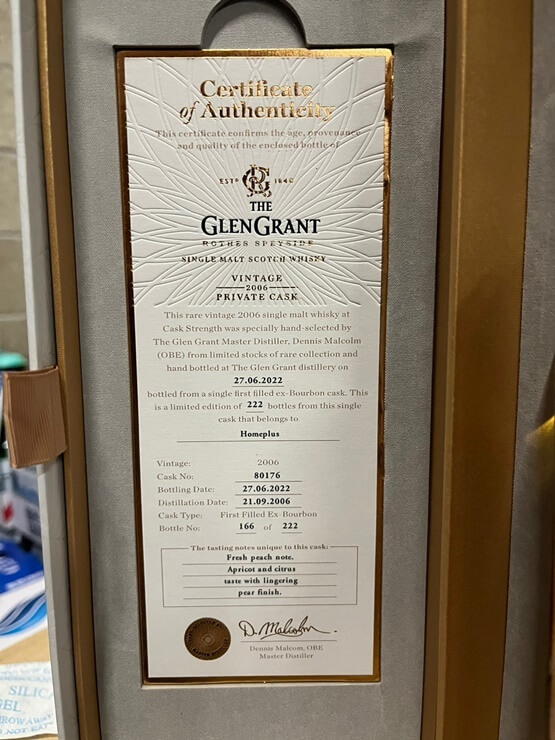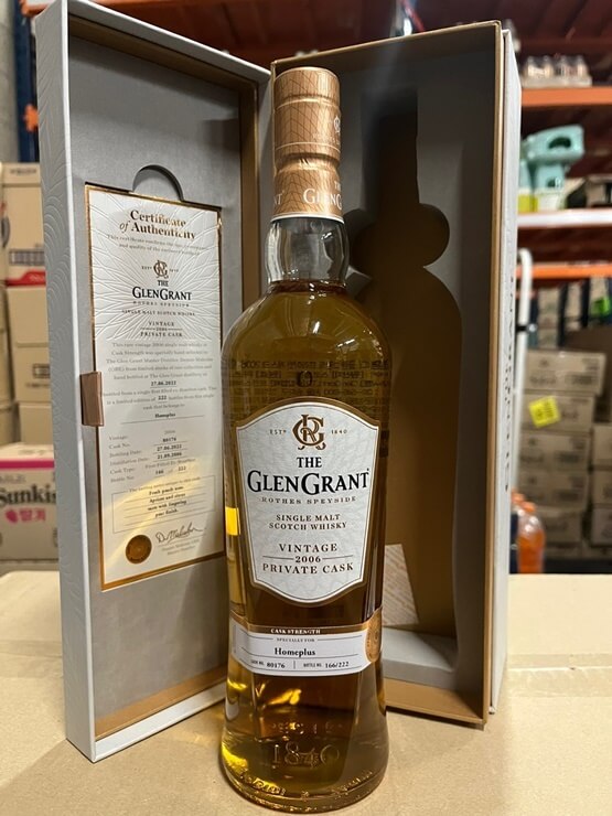 더 글렌글란트 2006 프라이빗 캐스크 홈플러스는 80176번 캐스크를 사용한 제품이며 2006년 9월 21일 증류하여 2022년 6월 27일에 병입 한 위스키입니다. 80176번 캐스크에서는 222병만이 한정적으로 생산되었으며 소개드리는 제품은 166번째 병입니다.