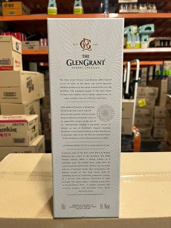 더 글렌그란트 2006 프라이빗 캐스크 홈플러스는 아메리칸 버번 캐스크에 15년 이상 숙성한 원액 그대로 병입 한 제품입니다. 물 한 방울 섞이지 않은 만큼 알코올 도수는 56.7도로 상당히 높습니다. 순수한 원액 그대로이기 때문에 소장할 가치가 더욱 높은 제품입니다.