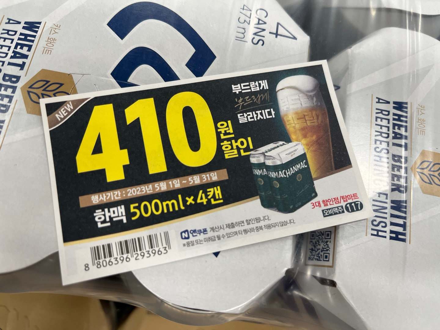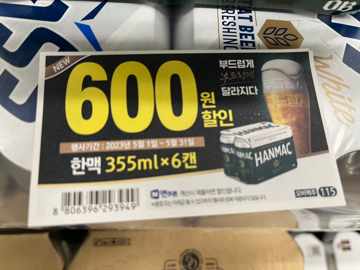 가장 선호하시는 맥주 한 캔이라 불리는 사이즈인 355ml 캔맥주입니다. 6캔으로 구성된 제품이며 355ml 캔 제품도 쿠폰 행사를 실시하고 있습니다. 오비맥주에서 한맥을 적극 홍보하고 있기에 할인행사도 진행되고 있습니다.