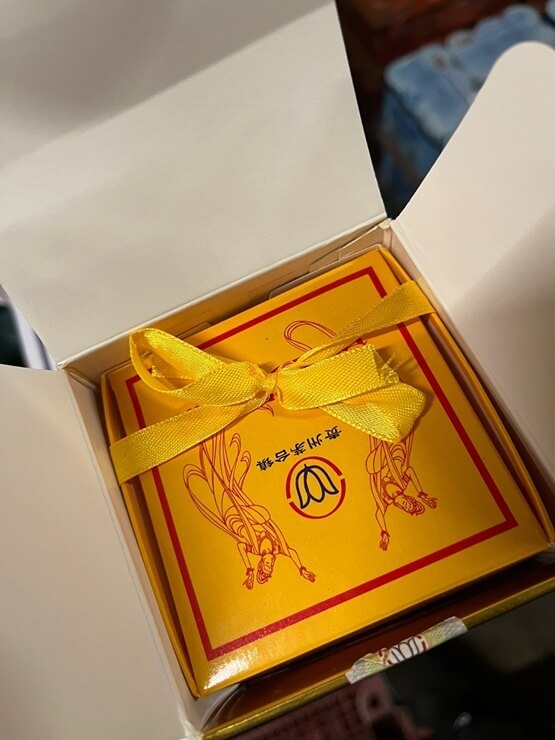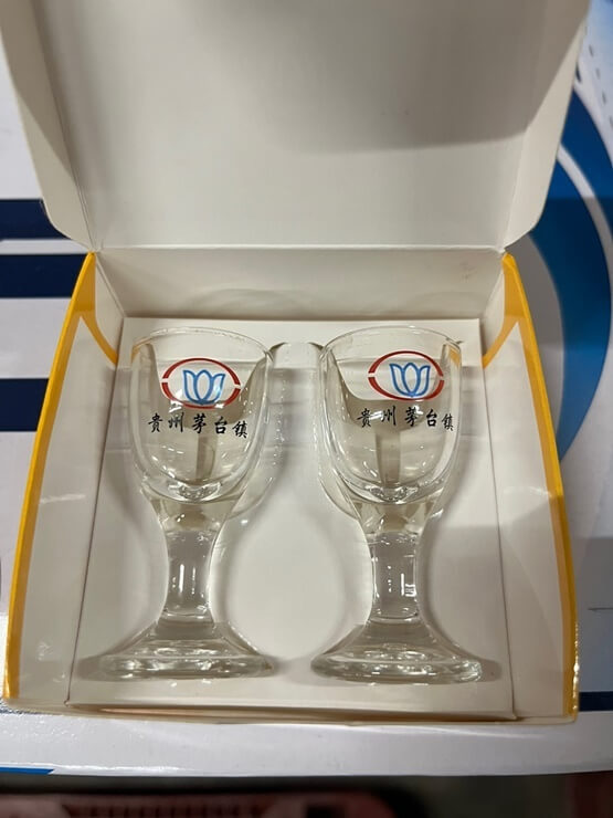 마오타이 황금주는 전용잔이 두 개 포함되어 판매되고 있습니다. 케이스 상단에 따로 잔이 포장되어 있습니다. 리본으로 잘 묶여 있어 고급스러움이 느껴집니다. 길이는 검지 손가락만 하며 유리재질로 되어 있습니다. 이러한 구성으로 선물용으로도 좋은 제품입니다.