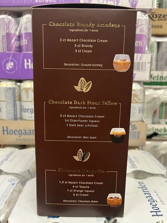 원산지는 오스트리아이며 벨기에 초콜릿을 사용한 제품입니다. 유크림 29.7%, 코코아버터 0.3%, 코코아추출물 1%, 코코아분말 5%, 다크 초콜릿 2%를 넣어 초콜릿의 풍미를 한껏 살린 술입니다.