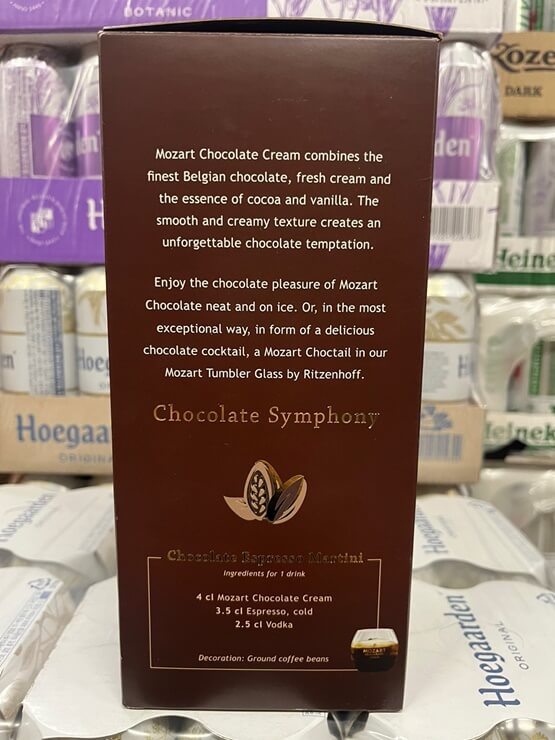 모차르트 초콜릿 크림은 부드러운 초콜릿이 가득 들어간 갈색 빛의 리큐르 제품입니다. 살살 녹는 밀크 초콜릿이 달콤한 풍미를 내어 입안을 가득 채웁니다. 처음과 끝까지 부드럽고 풍부한 맛을 유지하여 긴 여운을 남겨주는 제품입니다.