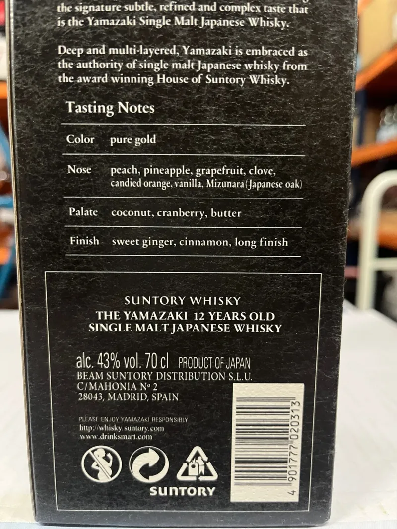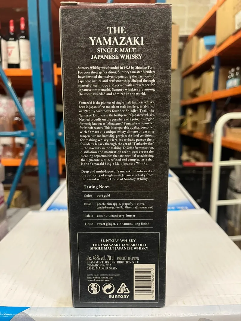 제품은 케이스와 위스키 본병으로 구성되어 있습니다. 특히 케이스 뒷면에는 야마자키 12년 위스키의 상세한 이야기가 실려있으며 테이스팅 노트도 아주 친절하게 설명되어 있습니다.