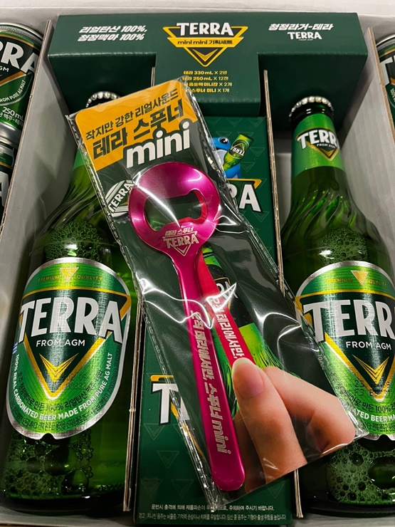 테라 미니 패키지는 테라 250ml 미니캔 12개와 테라 330ml 병 2개 그리고 사은품으로 미니 쏘맥잔 2개와 테라 미니스푸너 1개를 제공하고 있습니다.
