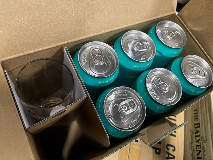 칭따오 500ml 용량의 캔 6개와 375ml 용량의 유리잔이 함께 들어있습니다.