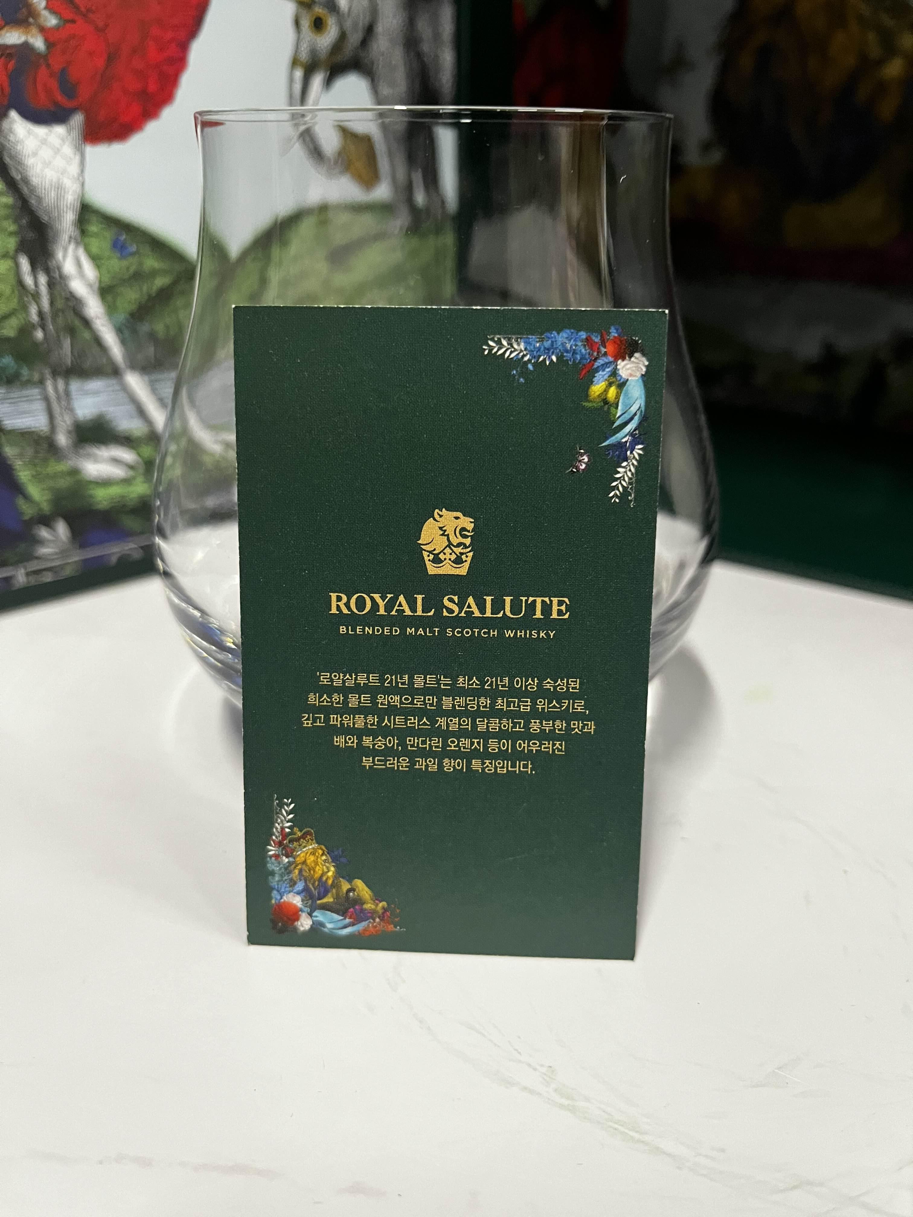 첫 번째는 전용잔입니다. 로얄 살루트의 맛을 깊게 느끼게 해 줄 수 있는 심플한 잔입니다. 전용잔의 구성이 잘 나오지 않는다는 점에서 매력적인 잔입니다.